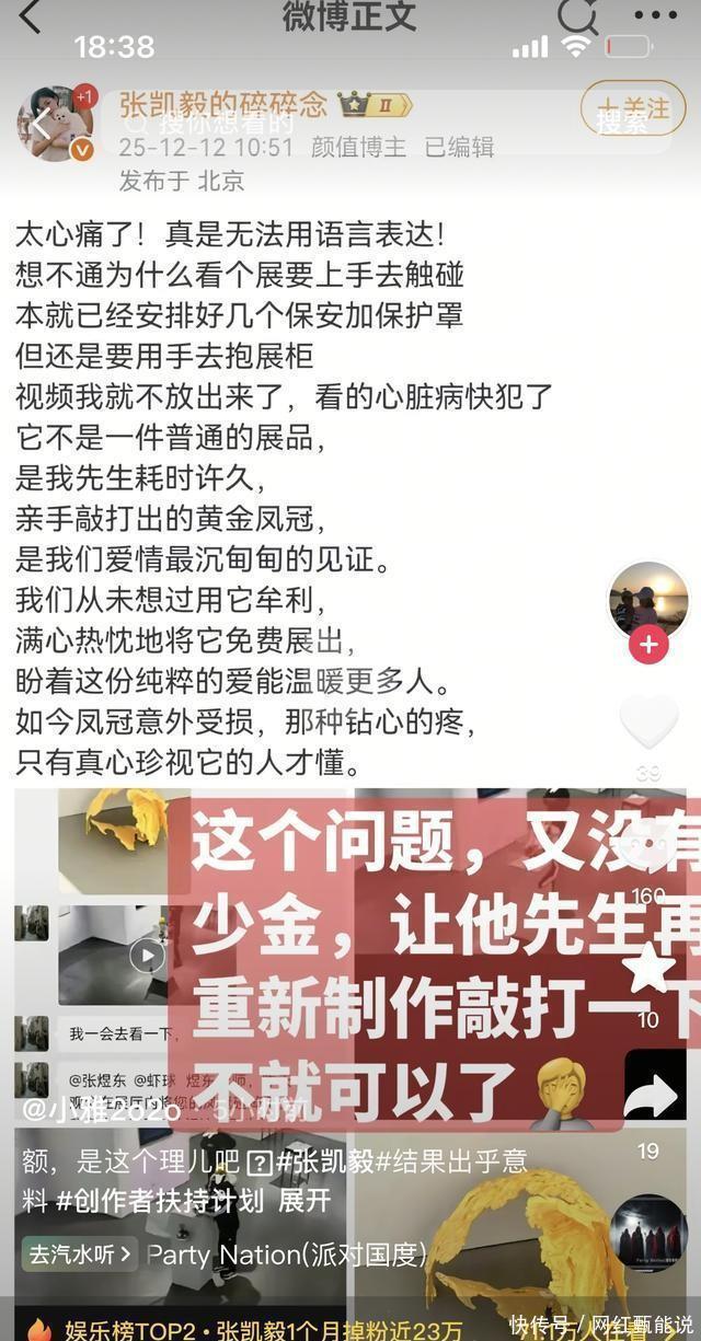 2025年12月,在北京举办的免费艺术展上,她老公亲手打造的4斤重黄金凤冠被男童触碰损坏,视频一发,评论区炸锅了,粉丝掉粉超43万,人设彻底翻车。 过往那些黑料也全被翻出来了。 视频里张凯毅穿着宽松孕妇装,肚子微微隆起,表情满是委屈和无奈,手势比划着凤冠掉地后的模样,丈夫在一旁低头不语,看起来俩人真挺心疼的,那凤冠金光闪闪,摔坏后碎片散落一地,读起来就觉得可惜。 整件事从12月13日开始,她在抖音发了个求助视频,说展览是免费的,以爱为主题,收集艺术家作品,本想传递正能量,谁知凤冠被小孩哈气擦拭时一碰就掉。