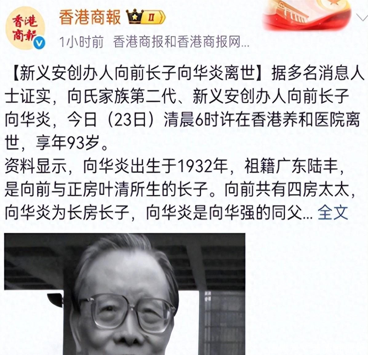 新义安二代掌舵人向华炎12月23日清晨,香港养和医院传出不幸消息,向氏家族第二代的长子向华炎离世,终年93岁。说起向华炎,可能很多人不太了解,但向华强和陈岚大家肯定都认识,向华炎正是他俩的哥哥。